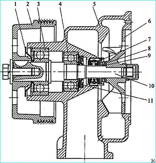 Насос водяной: 1 пылеотражатель; 2- шкив; 3 - подшипник 1160305; 4 - подшипник 1160304; 5 - корпус; 6 крыльчатка; 7 - сальник; 8 - кольцо упорное; 9 - кольцо уплотнительное; 10 валик; 11 манжета