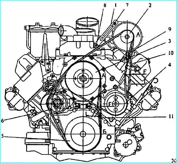 - - ослабить болт 11 крепления задней лапы генератора, гайку 10 крепления передней лапы генератора, болт 8 крепления планки генератора, болт 5 крепления болта натяжного;
