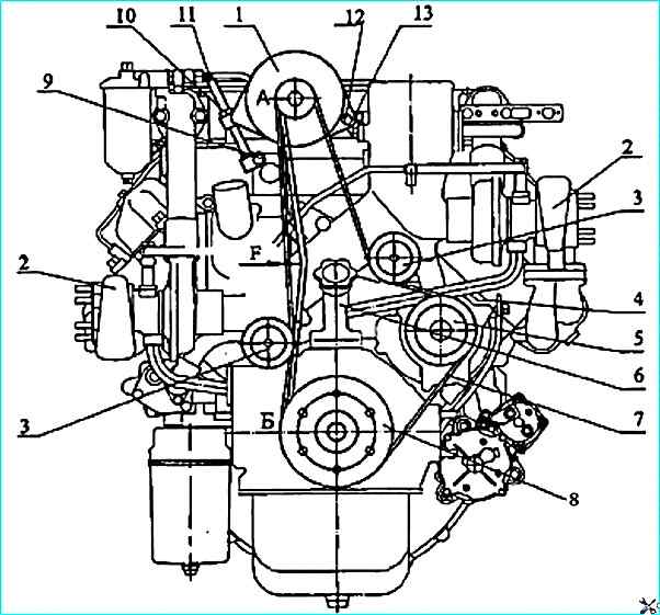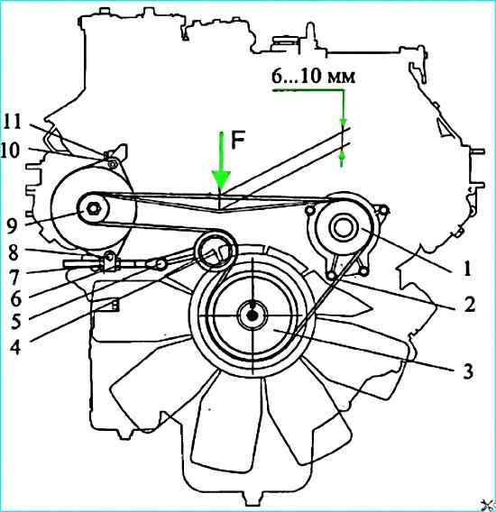 Натяжения ремня 10 привода генератора и водяного насоса выполнить следующим образом: