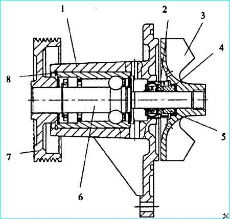 Насос водяной: 1 корпус; 2 сальник; 3 крыльчатка; манжета уплотнительная; 5 кольцо скольжения; 6 - подшипник радиальный шарико-роликовый с валиком; 7 - шкив; 8 - кольцо упорное