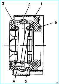 Сальник водяного насоса: 1 корпус наружный; 2 - манжета; 3 пружина; 4 внутренний каркас; 5 - наружный каркас; 6 кольцо скольжения