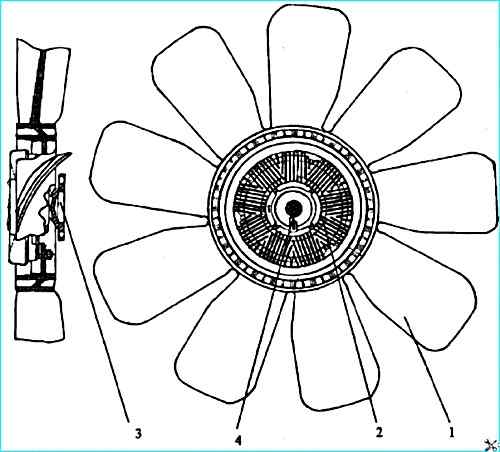 Для привода вентилятора применяется автоматически включаемая муфта 2 вязкостного типа, которая крепится к ступице вентилятора 3.