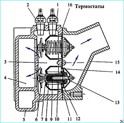 Термостаты: 1 - датчик указателя температуры; 2 датчик сигнализатора аварийного перегрева; 3 - канал выхода жидкости из двигателя; 4 канал перепуска жидкости на вход водяного насоса: 5 коробка водяная; 6 - перепускной клапан; 7 - пружина перепускного клапана; 8 резиновая вставка; 9 - наполнитель; 10 баллон; 11 пружина основного клапана; 12 основной клапан; 13 - поршень; 14 корпус; 15 патрубок водяной; 16 прокладка