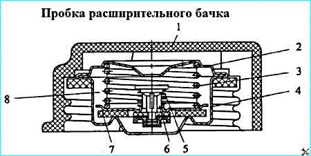 Пробка расширительного бачка: 1 - корпус пробки; 2- тарелка пружины выпускного клапана; 3 – пружина выпускного клапана; 4 седло выпускного клапана; 5 пружина клапана впускного; 6 клапан впускной в сборе; 7 прокладка выпускного клапана; 8 - блок клапанов