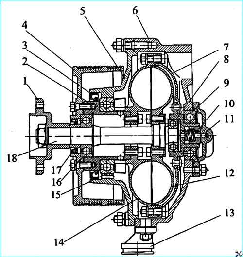 Гидромуфта привода вентилятора: 1 ступица вентилятора; 2 – вал шкива; 3 - манжета 740.1318166-01; 4 шкив; 5 корпус подшипника; 6 корпус-кронштейн; 7 кожух ведущего колеса; 8 подшипник 204; 9 - подшипник 207А; 10 уплотнитель; 11 крышка корпуса-кронштейна; 12 - колесо ведомое; 13 сливной патрубок; 14 колесо ведущее; 15 подшипник 114; 16 подшипник 305; 17 манжета 740.1318186-01; 18 - вал ведомого колеса