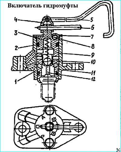 Включатель гидромуфты: 1 - корпус включателя; 2 кольцо уплотнительное; 3 - пружина; 4 - вилка; 5 тяга; 6 рычаг коробки; 7 - крышка; 8 - шарик фиксирующий; 9 пробка; 10 - шарик; 11 - клапан термосиловой; 12 - шток