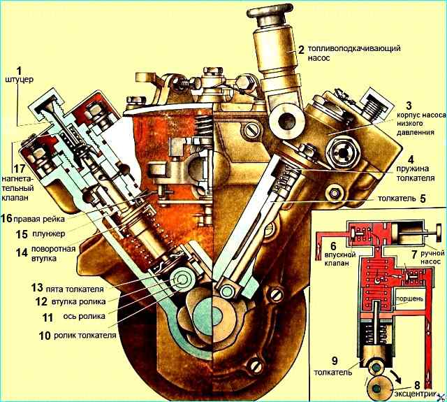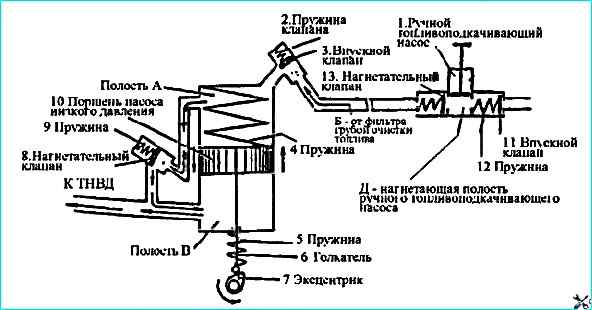 Топливоподкачивающий насос 13 (рис. ТНВД) поршневого типа, предназначен для подачи топлива от бака через фильтры грубой и тонкой очистки к впускной полости ТНВД.