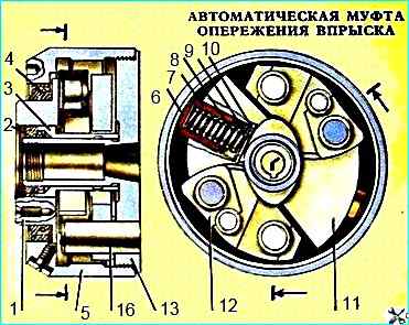 Автоматическая муфта опережения впрыска: 1 - ведущая полумуфта; 2, 4 - манжета; 3 - втулка ведущей полумуфты; 5 - корпус; 6 - регулировочные прокладки; 7 - стакан пружины; 8 пружина; 9, 15 - шайба; 10 - стопорное кольцо; 11 - груз с пальцем; 12 - проставка; 13 - ведомая полумуфта; 14 - уплотнительное кольцо; 16 - ось грузов