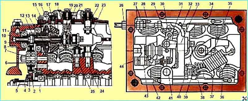 Всережимный регулятор частоты вращения: 1 - кулачковый вал; 2 - ведущая шестерня, 3 - резиновые сухари, 4 - фланец ведущей шестерни, 5 - эксцентрик привода ТНВД, 6,11,12 - шариковые подшипники; 7, 13, 24, 25, 41, 43 - оси; 8 - промежуточная шестерня, 9 - регулировочные шайбы, 10 - задняя крышка, 14 - стопорное кольцо, 15 - державка грузов; 16 - упорный подшипник, 17 - муфта грузов,18 - грузы; 19 - упорная пята; 20, 31 - палец, 21 - рычаг останова; 22 - валик рычага управления, 23 - рычаг пружины, 26, 27 - гайки, 28 - винт номинальной подачи топлива, 29 - штифты, 32 - рычаг муфты, 33 - рычаг регулятора; 34, 42 - рейки, 36 - рычаг стартовой пружины, 37 - рычаг рейки, 30, 35 - главная пружина регулятора, 38 - винт регулировочный, 39 - стартовая пружина, 40 - промежуточный рычаг реек, 44 - ролик