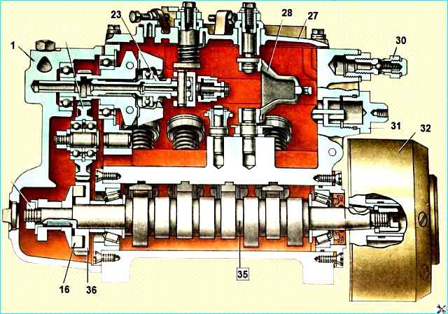 На кулачковом валу насоса размещено ведущее зубчатое колесо 36 регулятора, вращение которому передается через резиновые сухари 16.