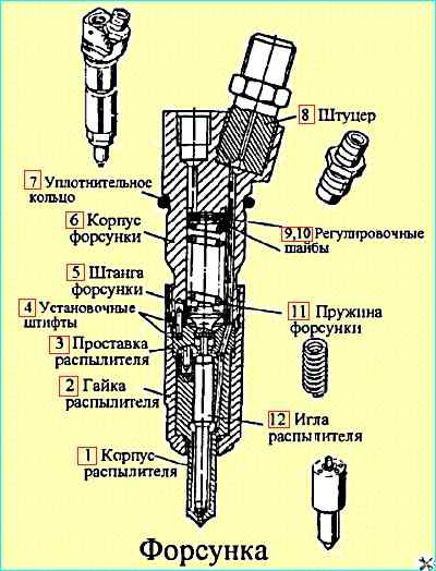 Пружина 11 одним концом упирается в штангу 5, которая передает усилие на иглу распылителя, другим - в набор регулировочных шайб 9, 10.