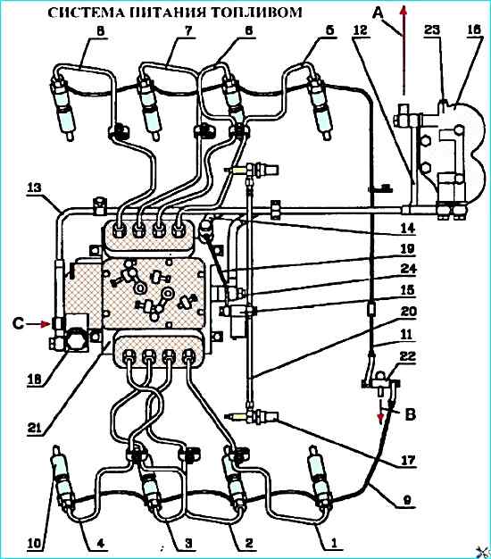 Система питания двигателя топливом: 1, 8 - трубки топливные высокого давления; 9 - трубка топливная дренажная форсунок левых головок; 10 - форсунка; 11 - трубка топливная дренажная форсунок правых головок; 12 - трубка топливная отводящая ТНВД; 13 - трубка отводящая топливного насоса; 14 - трубка топливная подводящая ТНВД: 15 - клапан ЭФУ; 16 - фильтр тонкой очистки топлива; 17 - свеча факельная; 18 - топливоподкачивающий насос; 19 трубка подвода топлива к клапану ЭФУ, 20 - трубка топливная от магнитного клапана к штифтовым свечам; 21 - ТНВД; 22 - тройник; 23 - клапан-жиклер; 24 - перепускной клапан ТНВД; (A, B) - слив топлива в бак; (C) - подвод топлива из фильтра грубой очистки топлива