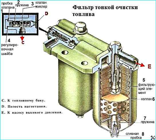 Фильтр тонкой очистки топлива (см. рис. Фильтр топкой очистки) окончательно очищает топливо перед поступлением в ТНВД.
