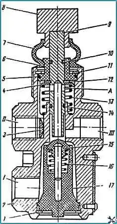 Пневматический кран: I - вывод к ресиверу; II - атмосферный вывод; III - вывод к пневматическим цилиндрам; 1,11,12 упорные кольца; 2 - корпус; 3 - фильтр; 4 - тарелка пружины штока; 5,10,14 - уплотнительные кольца; 6 - втулка; 7 - защитный чехол; 8 - кнопка; 9 - толкатель; 13 - пружина толкателя; 15 - клапан; 16 - пружина клапана; 17- направляющая клапана