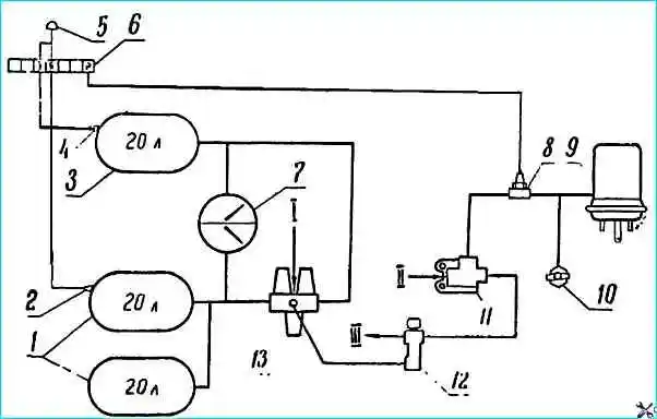 Контур аварийного растормаживания: 1 и 3 - баллоны; 2,4 и 8 - датчики; 5 - зуммер; 6 - блок контрольных ламп; 7- двухстрелочный манометр; 9 - энергоаккумуляторы; 10 - клапан контрольного вывода; 11 - двухмагистральный клапан; 12 - кран аварийного растормаживания; 13 - тройной защитный клапан; I - подача воздуха из конденсационного баллона; II - подача воздуха от ускорительного клапана при растормаживании стояночного тормоза; III - сброс воздуха из энергоаккумуляторов после отпускания кнопки крана