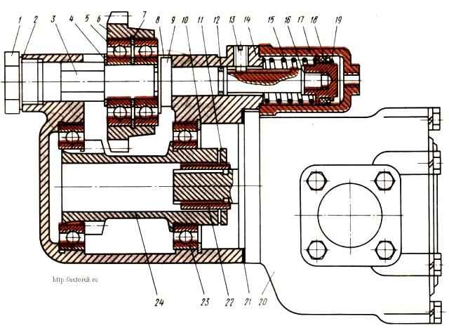 Крутящий момент от ведомой шестерни передается валу насоса.