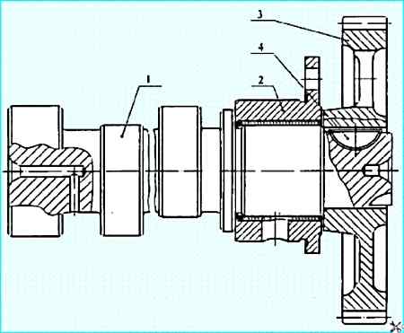 Распределительный вал: 1 - распределительный вал; 2 - корпус подшипника; 3 - шестерня; 4 - шпонка