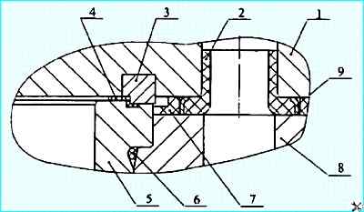 Газовый стык: 1 - головка цилиндра; 2 - кольцо уплотнительное перепуска охлаждающей жидкости; 3 - кольцо газового стыка; 4 - прокладка-заполнитель; 5 - гильза цилиндра; 6 - кольцо уплотнительное; 7 - прокладка уплотнительная; 8 - блок цилиндров: 9 - экран