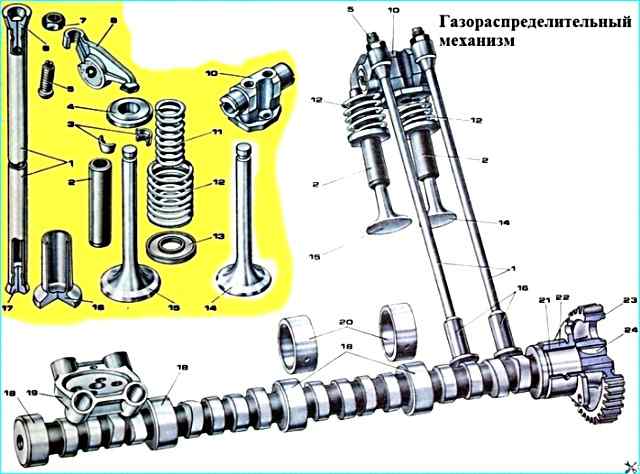 Газораспределительный механизм: 1 - штанга толкателя клапана; 2 - направляющие втулки клапанов; 3 - сухари крепления тарелки пружин; 4 - тарелка пружин; 5 - регулировочный винт; 6 - верхний наконечник штанги; 7 - гайка; 8 - коромысло клапана; 10 - стойка коромысла; 11 - внутренняя пружина клапана; 12 - наружная пружина клапана; 13 - шайба пружин; 14 - выпускной клапан; 15 - впускной клапан; 16 - толкатель клапана; 17 - нижний наконечник штанги; 18 - опорные шейки распредвала; 19 - направляющая толкателей; 20 втулки шеек распредвала; 21 - задняя втулка распредвала; 22 - корпус подшипника; 23 - шестерня распредвала; 24 - шпонка