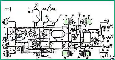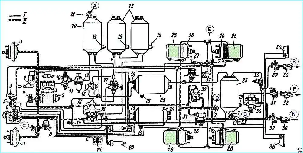 - - контура привода вспомогательной тормозной системы и потребителей — в ресивере контура.