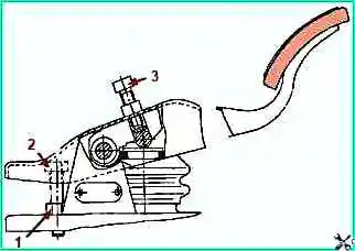 Регулировкой установочного и регулировочного болтов необходимо обеспечить положение площадки педали под углом 35˚±2˚ и свободный ход педали 10-15 мм.