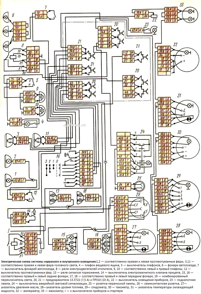 К системе наружного и внутреннего освещения автомобиля относятся фары головного света, противотуманные фары, передние фонари, задние фонари, подкапотная лампа, плафоны освещения вещевого ящика и спального места, патроны с лампами освещения приборов, плафоны кабины, переносная лампа.