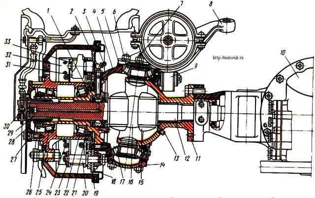 Передний ведущий мост: 1 - цапфа поворотного кулака; 2 - переходной штуцер; 3 - ввертный штуцер; 4 - поворотный кулак; 5 - регулировочная прокладка; 6, 27 - разжимные втулки; 7 - масленка; 8 - рычаг поворотного кулака; 9 - регулировочный рычаг; 10 - главная передача; 11 - шаровая опора; 12 - внутренний кулак; 13 -пробка; 14 - накладка кулака; 15 - вкладыш кулака шарнира; 16 - диск шарнира; 17, 22, 25 - роликоподшипники конические; 18 - щиток; 19 - суппорт; 20 - ось колодок; 21 - запорное кольцо; 23 - накладка осей колодок; 24 - пружина колодок тормоза; 26 - левая ступица с тормозным барабаном; 28 - ведущий фланец; 29 - наружный кулак шарнира; 30 - кран запора воздуха; 31 - разжимный кулак; 32 - колодка переднего тормоза; 33 - ролик колодки