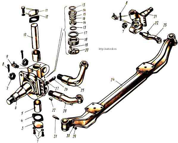Передний мост автомобилей с колесной формулой 6X4: 1 - болты; 2, 30 - пружинные шайбы; 3 - крышка поворотного кулака нижняя; 4 - прокладка крышки; 5 - втулка шкворня; 6 - кулак поворотной передней оси левый; 7, 27, 29 - гайки; 8 - разводной шплинт; 9 - масленка; 10 - шкворень; 11 - предохранительный клапан; 12 - крышка поворотного кулака верхняя; 13 - уплотнительное кольцо; 14 - обойма сальника; 15 - шайба кулака; 16 - регулировочная шайба;17 - полукольцо сальника; 18 - кольцо опорного подшипника; 19 - штифт; 20 - шайба опорного подшипника; 21 - кулак поворотный правый; 22 - сегментная шпонка; 23 - рычаг поворотного кулака к тяге рулевой трапеции правый; 24 - балка передней оси; 25 - рычаг поворотного кулака к тяге сошки рулевого механизма; 26 - упор поворотного кулака; 28 - рычаг поворотного кулака к тяге рулевой трапеции, левый; 31 - клин шкворня