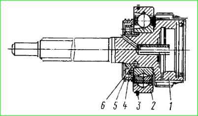 Ведущий вал в сборе: 1 - вал ведущий; 2 - подшипник шариковый; 3 - кольцо стопорное подшипника; 4 - гайка кольцевая; 5 - кольцо маслонагнетающее; 6 - шарик стопорный