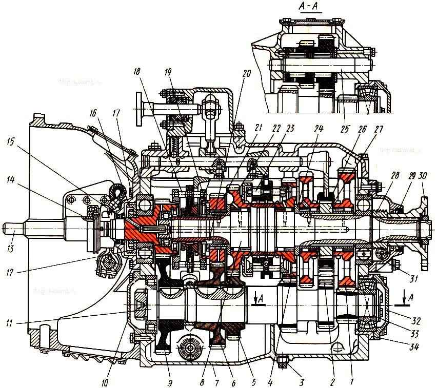 Пятиступенчатая коробка передач с картером сцепления в сборе: 1 - шестерня первой передачи вторичного вала; 2 - блок шестерен заднего хода; 3 - пробка сливного отверстия; 4 - шестерня второй передачи вторичного вала; 5 - шестерня третьей передачи промежуточного вала; 6 - шестерня четвертой передачи промежуточного вала; 7 - картер; 8 - вторичный вал; 9 - шестерня привода промежуточного вала; 10 – крышка переднего подшипника промежуточного вала; 11 -промежуточный вал; 12 - кольцевая гайка крепления подшипника; 13 - первичный вал; 14 – муфта выключения сцепления; 15 - манжета; 16 - маслонагнетающее кольцо; 17 - крышка заднего подшипника первичного вала; 18 – синхронизатор четвертой и пятой передач; 19 - упорная шайба; 20 - замочная шпонка упорной шайбы; 21 - шестерня четвертой передачи вторичного вала; 22 - шестерня третьей передачи вторичного вала; 23 - синхронизатор второй и третьей передач; 24 - втулка шестерни заднего хода; 25 – ось блока шестерен заднего хода; 26 - муфта включения заднего хода и первой передачи; 27 - втулка шестерни первой передачи; 28 -червяк привода спидометра; 29 - манжета крышки подшипника вторичного вала; 30 - фланец; 31 - крышка заднего подшипника вторичного вала; 32 - задняя крышка промежуточного вала; 33 - упорная шайба; 34 – стакан подшипника