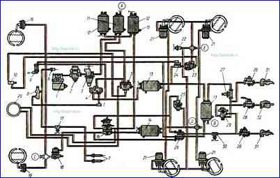 В контур входит также трубопровод, соединяющий верхнюю секцию тормозного крана 16 с клапаном 26 управления тормозными системами прицепа.