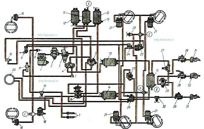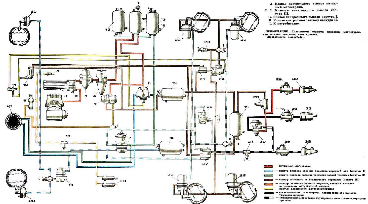 При описании составных частей и принципа работы за основу принят пневмопривод автомобиля КамАЗ-5320. Однако следует знать, что тормозные приводы других автомобилей имеют свои отличительные особенности.