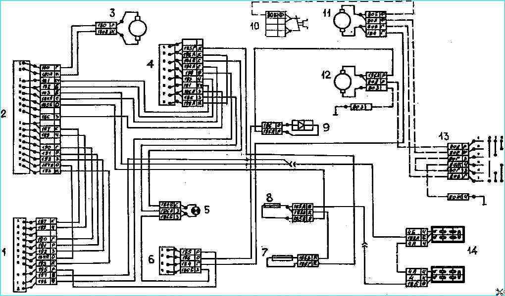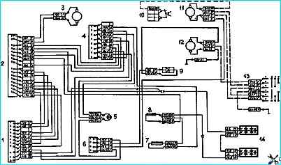 Электрическая схема подогревателя: 1 котел подогревателя; 2 - блок управления; 3 - электродвигатель насоса; 4 - таймер; 5 - сигнализатор КОМ; 6 - терморегулятор; 7, 8, 10 - предохранители 10А; 9 - диод с защитным корпусом; 11, 12 - электродвигатели отопителя; 13 - переключатель электродвигателей отопителя; 14 - аккумуляторные батареи