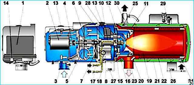 Предпусковой подогреватель: 1 - блок управления; 2 - электродвигатель постоянного тока; 3 - всасывающий патрубок; 4 - муфта: 5 - вентилятор: 6 подшипник; 7 зубчатая передача; 8 - топливный насос; 9 - электромагнитный клапан; 10 корпус форсунки; 11 форсунка; 12 электрод зажигания; 13 - держатель электродов; 14 перепускной клапан; 15 - индикатор пламени: 16 диск; 17 - трубка подвода топлива; 18 - трубка отвода топлива; 19 - теплообменник: 20 - завихритель; 21, 22- трубы теплообменника; 23 - патрубок для выхода отработавших газов; 24 - патрубок «входа»; 25 - патрубок «выхода»; 26, 27 - кронштейны подогревателя; 28 - источник питания высоковольтный; 29 - термопредохранитель: 30, 31 - датчики для управления работой подогревателя