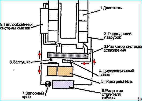 Схема подключения подогревателя к системе охлаждения двигателя и отопления кабины (см. рис. 3) позволяет оптимально использовать тепловую энергию подогревателя за счет создания различных контуров циркуляции теплоносителя.