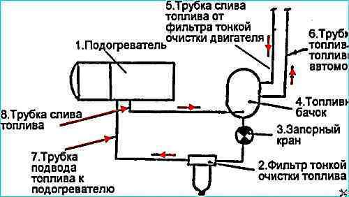 При работе подогревателя топливо насосом подается под давлением форсунке. Излишки топлива от топливного насоса поступают снова в бачок подогревателя.