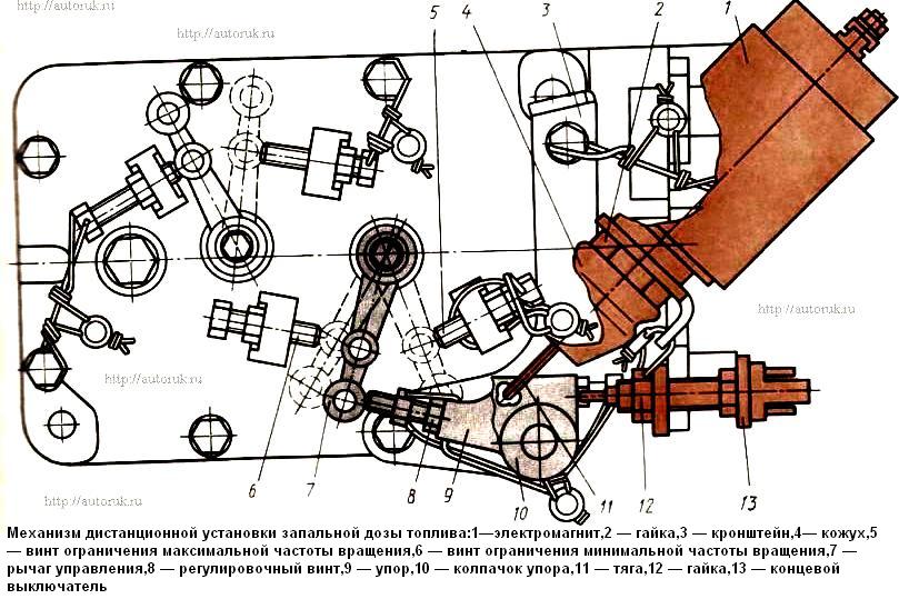 На верхней крышке регулятора частоты вращения расположен механизм установки запальной дозы топлива.