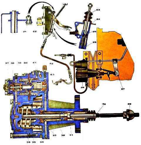 - - снимите оттяжную пружину рычага вала вилки выключения сцепления, отсоедините воздушный трубопровод пневмогидроусилителя, гидравлический шланг и слейте жидкость из системы гидропривода;