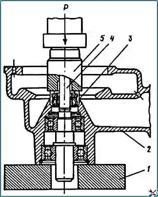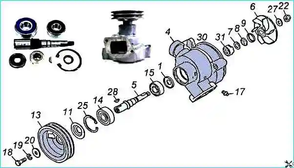 Для замены сальника водяной насос разбирается в следующей последовательности: отгибается стопорная шайба и отворачивается колпачковая гайка, при этом надо удержать от проворачивания валик.
