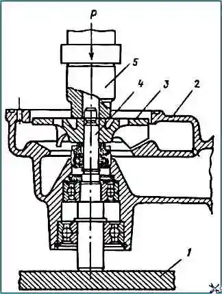 После этого на валик насоса оправкой напрессовывается уплотнение, как показано на рисунке, и другой оправкой напрессовывается крыльчатка, как показано на рисунке.