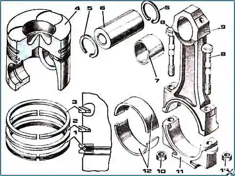 На крышке и шатуне нанесены метки спаренности в виде трехзначных порядковых номеров. Кроме того, на крышке шатуна выбит порядковый номер цилиндра.