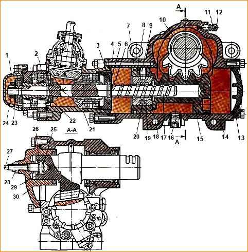 Толщина зубьев сектора вала сошки и поршня-рейки переменная по длине, что позволяет изменить зазор в зацеплении осевым перемещением регулировочного винта 27, ввернутого в боковую крышку 30.