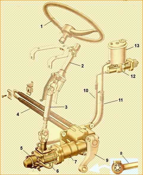 Рулевое управление состоит из рулевого колеса 1, колонки 2, вал которой через карданную передачу 3 соединен с рулевым механизмом 7, и рулевого привода.