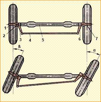 При повороте одного колеса через рычаги 3 и 6 и тягу 4 поворачивается и другое колесо.