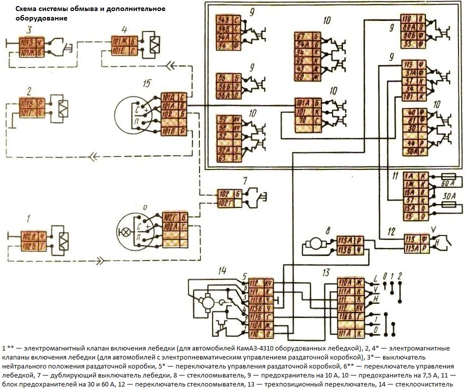 Кроме того, на автомобилях повышенной проходимости, имеющих в своей трансмиссии раздаточную коробку и лебедку, для переключения передач в раздаточной коробке и включения коробки отбора мощности предусмотрена система дополнительного электрооборудования.