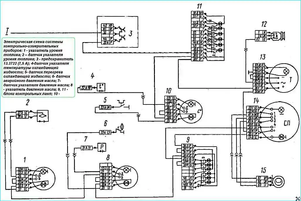 Электрическая схема системы контрольно-измерительных приборов: 1 – указатель уровня топлива; 2 – датчик указателя уровня топлива; 3 – предохранитель 13.3722 (7,5 А); 4 – датчик указателя температуры охлаждающей жидкости; 5 – датчик перегрева охлаждающей жидкости; 6 – датчик аварийного давления масла; 7 – датчик указателя давления масла; 8 – указатель давления масла; 9, 11 – блоки контрольных ламп