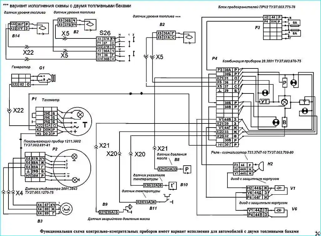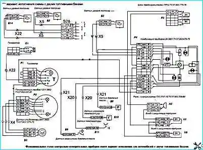 Функциональная схема контрольно-измерительных приборов имеет вариант исполнения для автомобилей с двумя топливными баками. Этот вариант представлен на рисунке 2.