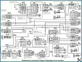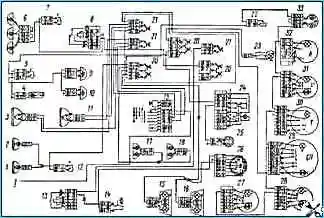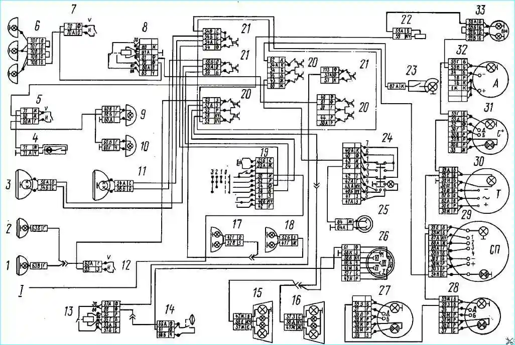 Электрическая схема системы наружного и внутреннего освещения: 1, 2 - фары противотуманные правая и левая; 3,11 - фары головного света правая и левая; 4 - плафон вещевого ящика; 5 - выключатель плафонов; 6 - фонари автопоезда; 7 - выключатель фонарей автопоезда; 8 - реле электродвигателей отопителя; 9,10- плафоны кабины левый и правый; 12 - выключатель противотуманных фар; 13 - реле сигналов торможения; 14 - выключатель электромагнитного клапана прицепа; 15,16 - фонари задние правый и левый; 17,18- фонари передние правый и левый; 19 - переключатель света комбинированный; 20 - предохранитель 13.3722 (7,5 А); 21 - предохранитель ПР-310 (10 А); 22 - выключатель освещения приборов; 23 - лампа подкапотная; 24 - выключатель аварийной световой сигнализации; 25 - розетка переносной лампы; 26 - розетка семиконтактная; 27 - указатель давления масла; 28 - указатель уровня топлива; 29 - спидометр; 30 - тахометр; 31 - указатель температуры охлаждающей жидкости; 32- амперметр; 33 - манометр; 1-к выключателю приборов и стартера