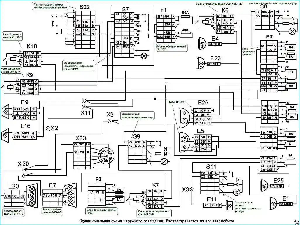 Соединение всех потребителей с источником питания выполнено по однопроводной схеме за исключением плафона 4 вещевого ящика, минусовый вывод которого выведен на панель предохранителей.