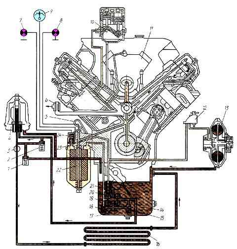 Схема смазочной системы: 1 - сливной клапан масляного радиатора; 2 - перепускной клапан центробежного фильтра; 3 – кран включения масляного радиатора; 4 - центробежный масляный фильтр (центрифуга); 5 - указатель уровня масла; 6 - сапун; 7 - лампа сигнализатора засорения полнопоточного масляного фильтра; 8 - лампа сигнализации падения давления масла; 9 - манометр; 10 - компрессор; 11 - топливный насос высокого давления; 12 - выключатель гидромуфты; 13 -гидромуфта привода вентилятора;14 - поддон картера; 15, 18 - предохранительные клапаны радиаторной и нагнетающей секций масляного насоса; 16 - масляный радиатор; 17 - маслоприемник; 19, 20 - радиаторная и нагнетающая секции масляного насоса; 21 - дифференциальный клапан смазочной системы; 22 - полнопоточный масляный фильтр; 23 - главная масляная магистраль; 24 - перепускной клапан полнопоточного фильтра с сигнализатором засорения